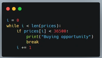 반복문은 자동매매 프로그램에서 시장 데이터를 처리하거나 거래 조건을 확인하는 데 필수적입니다. 주로 for 문과 while 문을 사용합니다.
